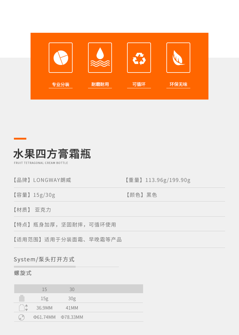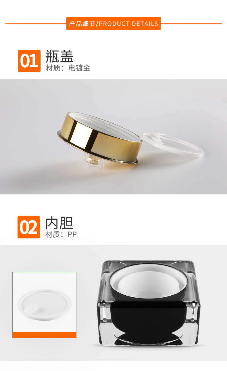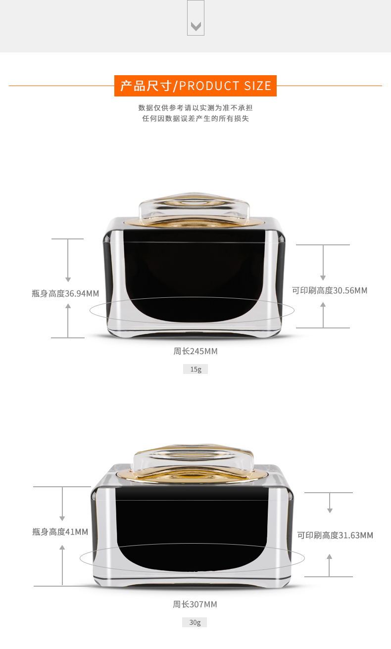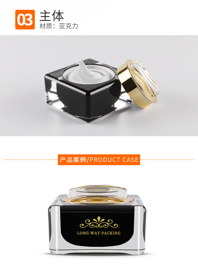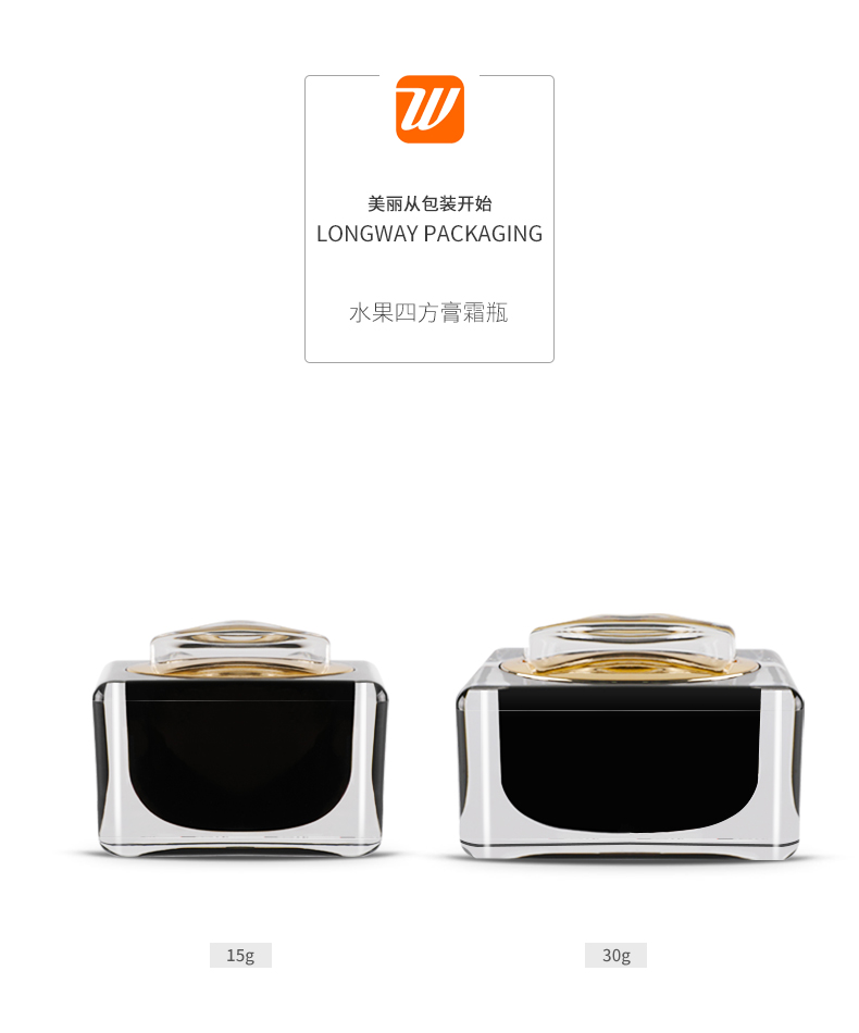 • 规格15g四方黑色亚克力膏霜瓶  30g四方黑色亚克力膏霜瓶