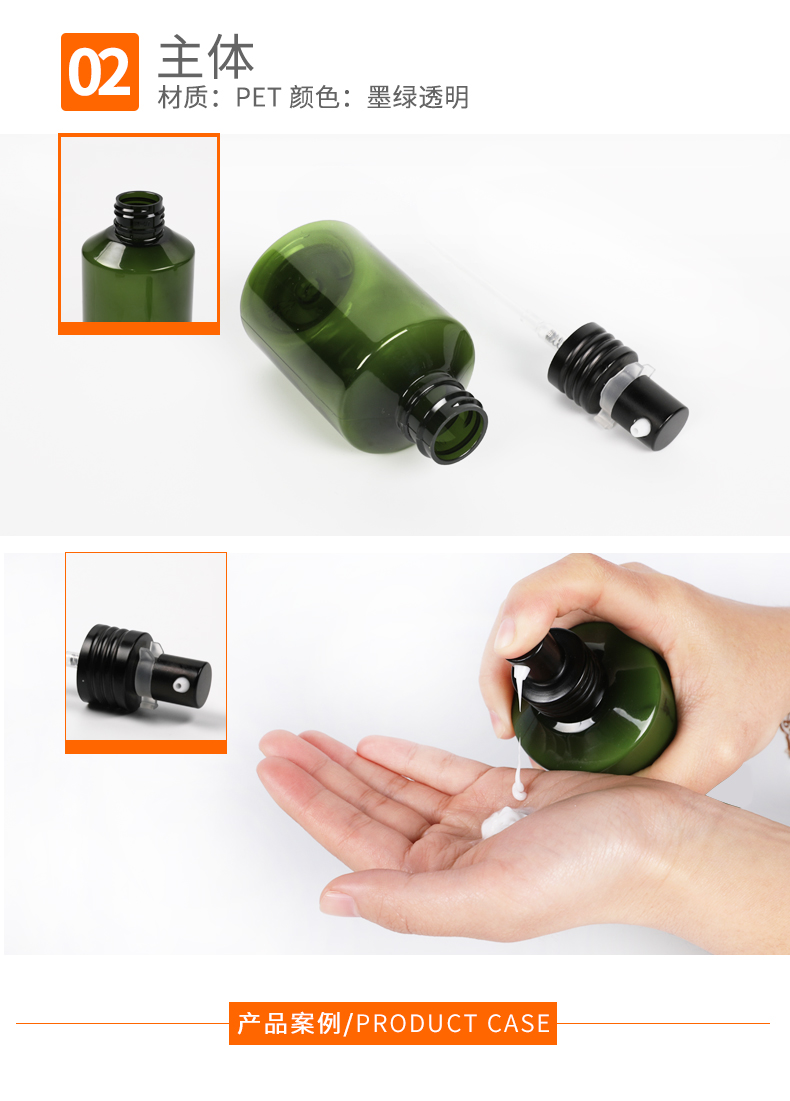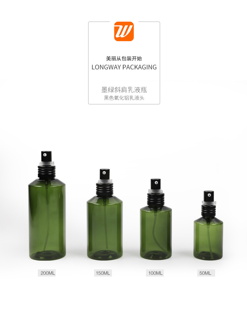 • 规格 50ml墨绿斜肩乳液瓶   100ml墨绿斜肩乳液瓶   150ml墨绿斜肩乳液瓶   200ml墨绿斜肩乳液瓶