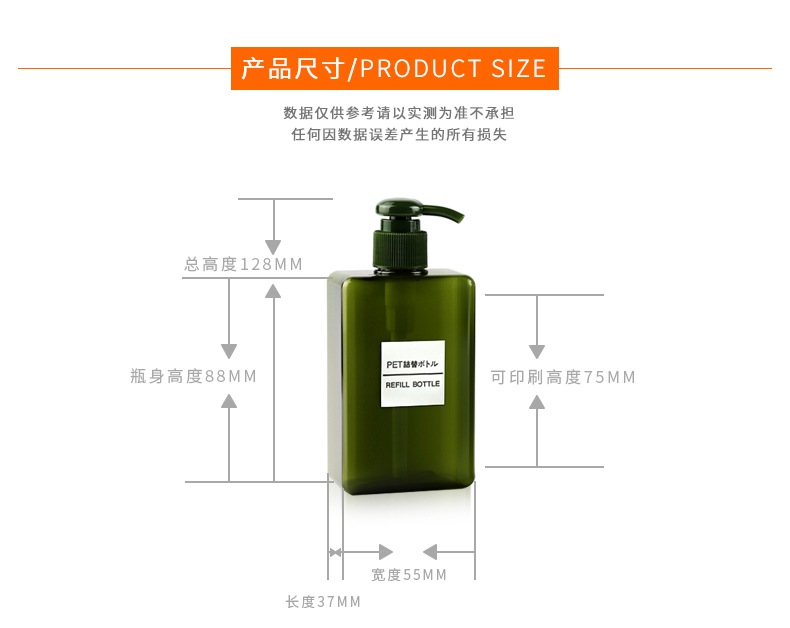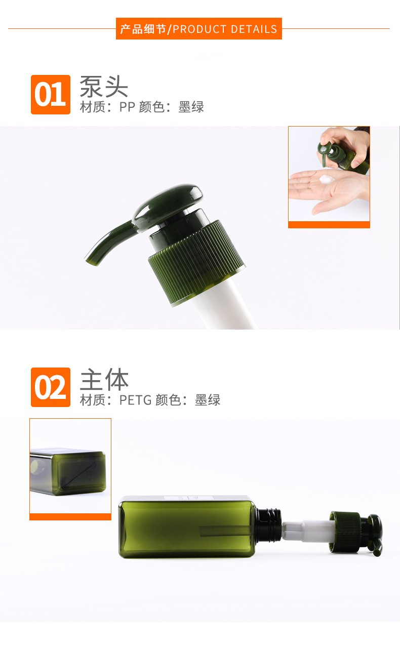 • 规格 150ML透明乳液瓶   150ML白色乳液瓶   150ML墨绿色乳液瓶   150ML棕色乳液瓶   150ML淡蓝色乳液瓶(透明头)   150ML透粉色乳液瓶(透明头)