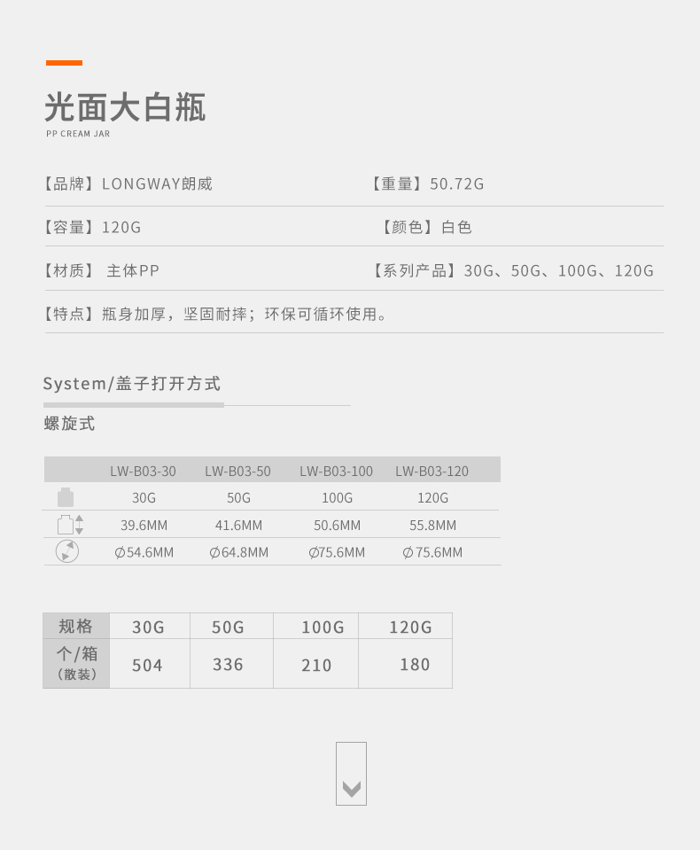 • 规格 30g光面大白瓶   50g光面大白瓶   100g光面大白瓶   120g光面大白瓶