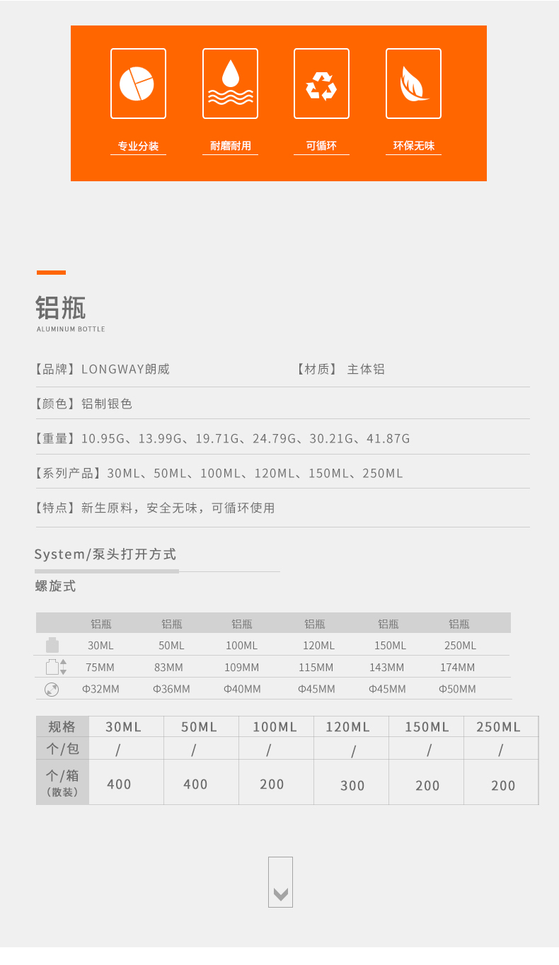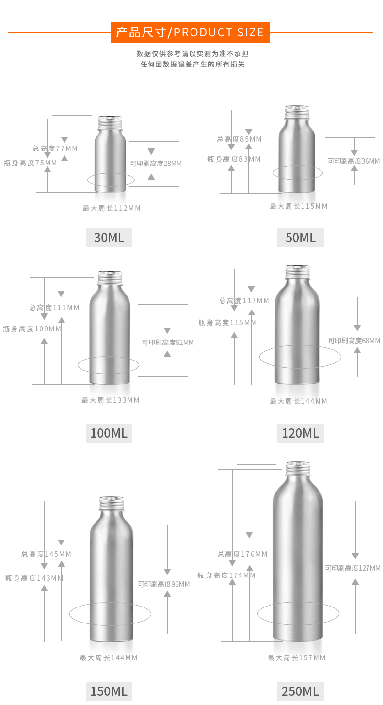 • 规格30ml铝瓶+R24铝盖  50ml铝瓶+R24铝盖  100ml铝瓶+R24铝盖  120ml铝瓶+R24铝盖  150ml铝瓶+R24铝盖  250ml铝瓶+R24铝盖