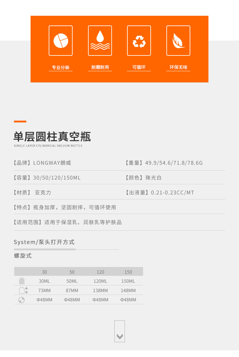 • 规格 30ml亚克力单层圆柱真空瓶   50ml亚克力单层圆柱真空瓶   120ml亚克力单层圆柱真空瓶   150ml亚克力单层圆柱真空瓶