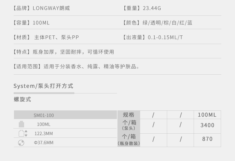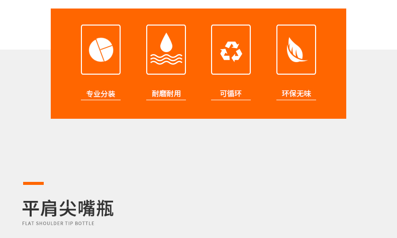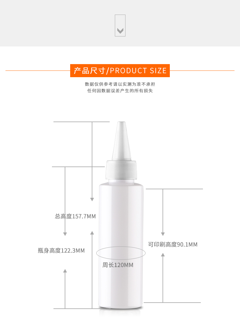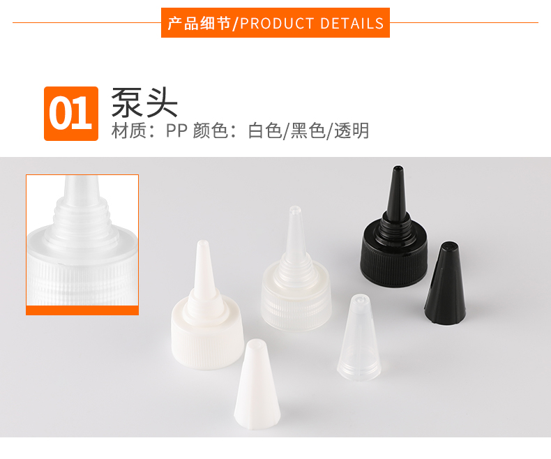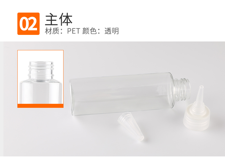 • 规格 100ml/透明+透明尖嘴盖   100ml/透明+白色尖嘴盖   100ml/透明+黑色尖嘴盖   100ml/白色+透明尖嘴盖   100ml/白色+白色尖嘴盖   100ml/白色+黑色尖嘴盖   100ml/蓝色+白色尖嘴盖   100ml/棕色+透明尖嘴盖   100ml/棕色+白色尖嘴盖   100ml/棕色+黑色尖嘴盖   100ml/绿色+透明尖嘴盖   100ml/绿色+白色尖嘴盖   100ml/绿色+黑色尖嘴盖   100ml/红色+透明尖嘴盖   100ml/红色+白色尖嘴盖   100ml/红色+黑色尖嘴盖