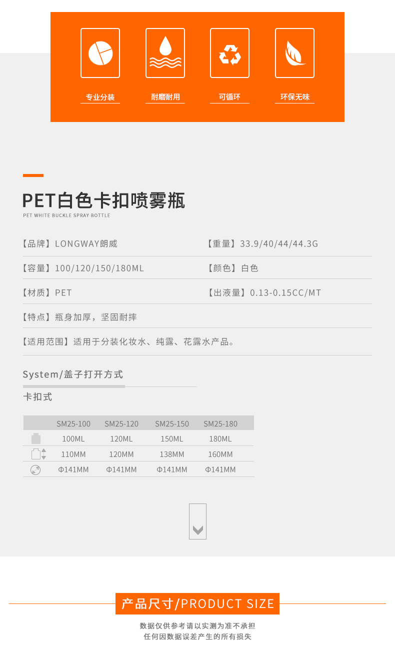• 规格100mlpet白色卡扣喷雾瓶  120mlpet白色卡扣喷雾瓶  150mlpet白色卡扣喷雾瓶  180mlpet白色卡扣喷雾瓶