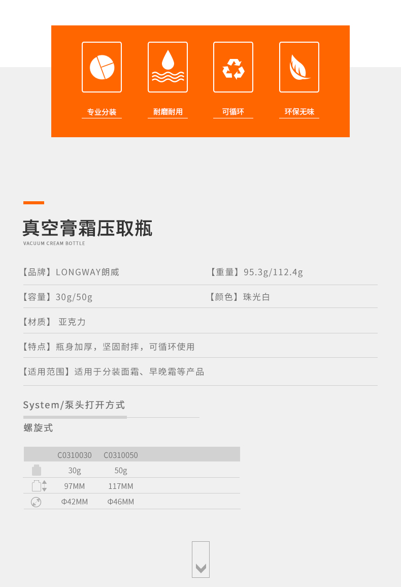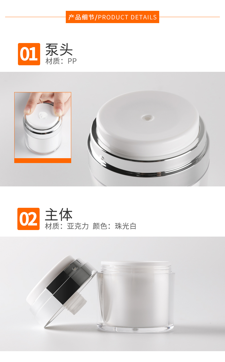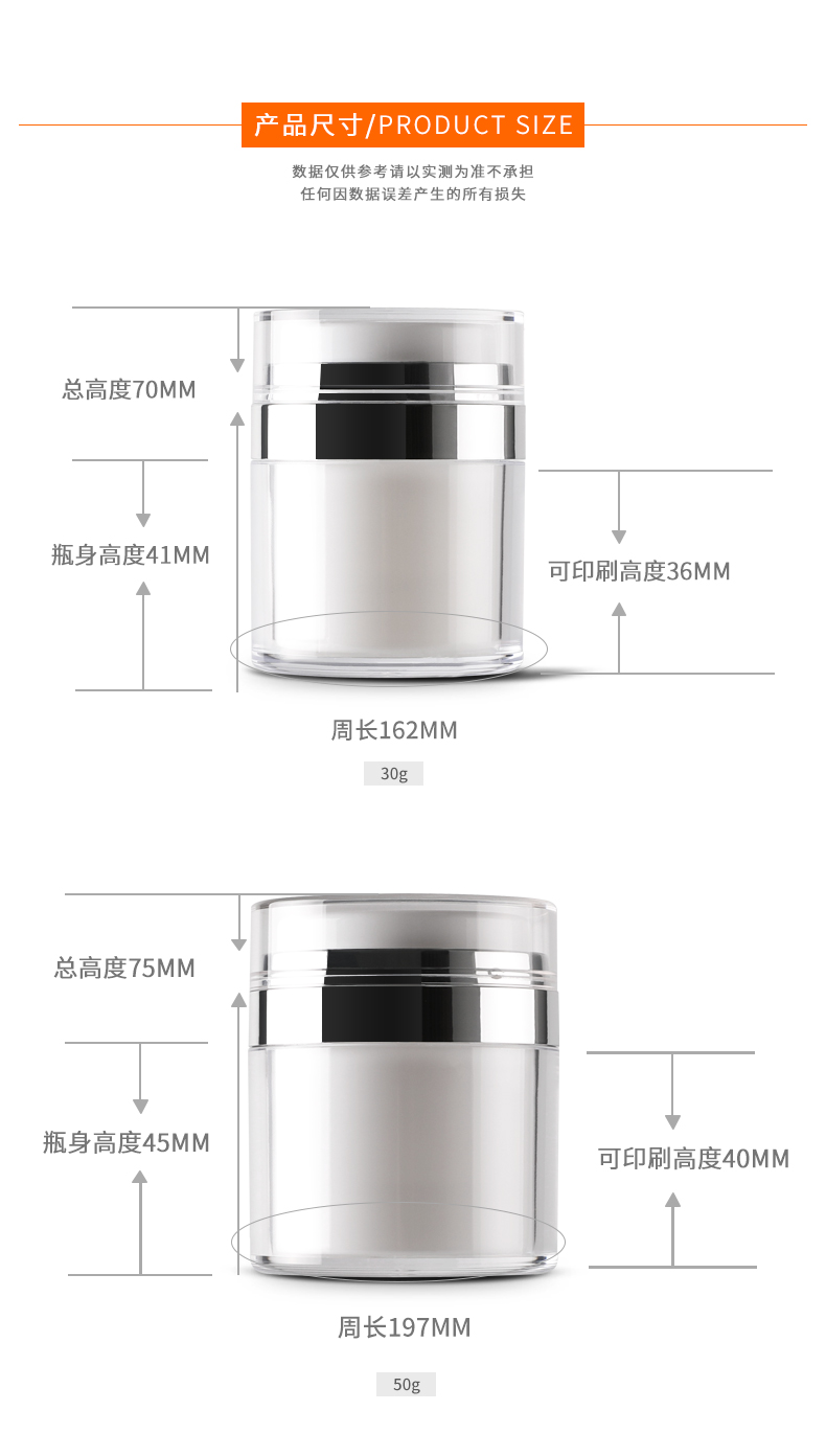 • 规格 30g亚克力真空压取膏霜瓶   50g亚克力真空压取膏霜瓶