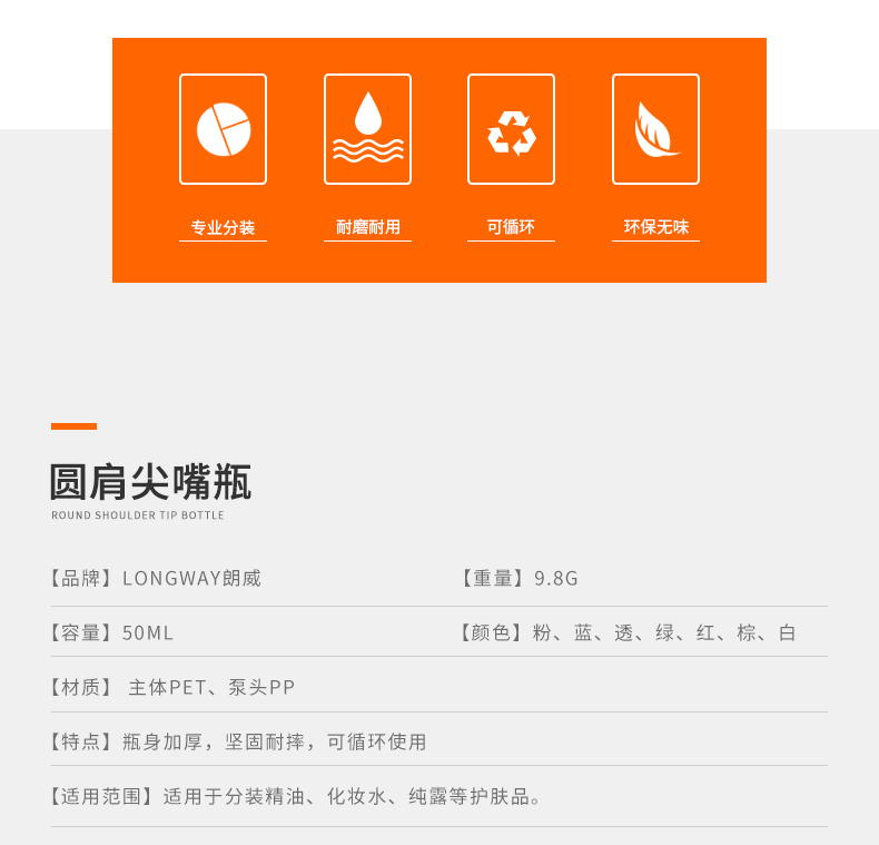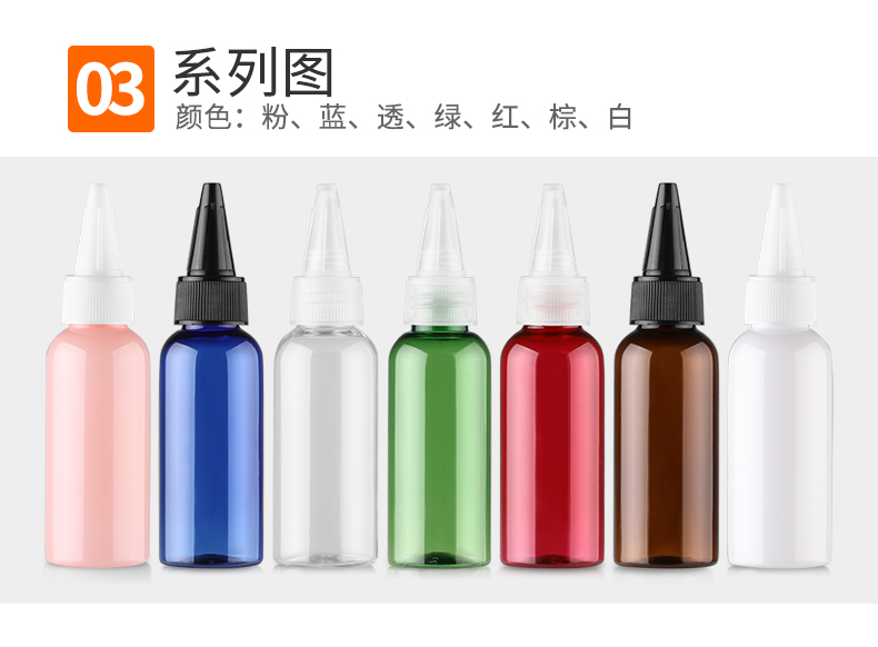 • 规格50ml透明+透明尖嘴盖  50ml透明+白色尖嘴盖  50ml透明+黑色尖嘴盖  50ml蓝色+透明尖嘴盖  50ml蓝色+白色尖嘴盖  50ml蓝色+黑色尖嘴盖  50ml棕色+透明尖嘴盖  50ml棕色+白色尖嘴盖  50ml棕色+黑色尖嘴盖  50ml白色+透明尖嘴盖  50ml白色+白色尖嘴盖  50ml白色+黑色尖嘴盖  50ml粉色+透明尖嘴盖  50ml粉色+白色尖嘴盖  50ml粉色+黑色尖嘴盖  50ml红色+透明尖嘴盖  50ml红色+白色尖嘴盖  50ml红色+黑色尖嘴盖  50ml绿色+透明尖嘴盖  50ml绿色+白色尖嘴盖  50ml绿色+黑色尖嘴盖