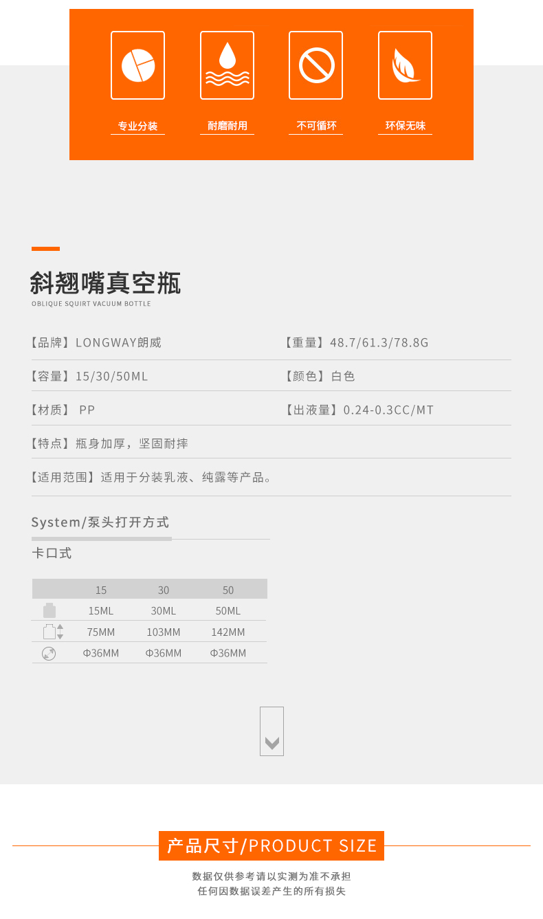 • 规格15ml斜翘嘴真空瓶  30ml斜翘嘴真空瓶  50ml斜翘嘴真空瓶