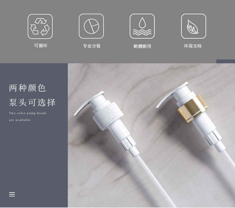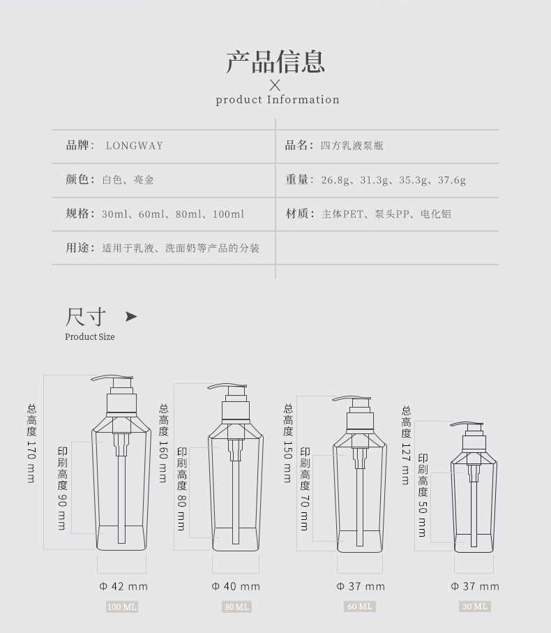 • 规格100ml白色泵头  100ml亮金泵头  150ml白色泵头  150ml亮金泵头  200ml白色泵头  200ml亮金泵头  250ml白色泵头  250ml亮金泵头